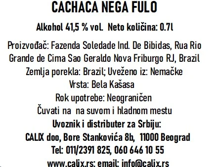 Nega Fulo je Super Premium Cachaca i odlikuje se elegantnom notom šećerne trske i punoćom ukusa i mirisa. Brazilci uživaju u čistom i rashlađenom ili kao caipirinha. Srca biljaka šećerne trske se istiskuju, a sok šećerne trske fermentira. Nakon toga sledi dvostruka destilacija u bakarnim kotlićima - izuzetno redak proces za Cachacu. Za razliku od belog ruma, koji koristi melasu od šećerne trske, Premium Cachaca destilat se pravi od 100% svežeg soka šećerne trske.