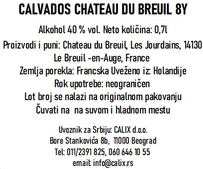 Izuzetno piće koje predstavlja savršen odnos kvaliteta i novca je definitivno Calvados star 8 godina. Kalvados je jako i veoma posebno alkoholno piće proizvedeno od jabuke. Pogotovo je dobro za degustaciju čak i za one koji nisu poznavaoci, i nemaju iskustva sa degustacijom jačih alkoholnih pića. Kalvados takođe važi za plemićko piće koje iako poseduje nešto veći procenat alkohola, sadrži i svežinu. Cenjeno je zbog dugog odležavanja. Chateau du Breuil je stari zamak u srcu Pais d'Auge, građevine od crvene cigle i drvene građe koje datira iz 16.-17. veka. Ovde su nekada živele porodice Buketo, Montgomeri i Bens. Danas se tamo nalazi jedna od najpoznatijih destilerija Kalvadosa. Kompaniju Chateau du Breuil osnovao je 1954. godine Philippe Bizouard, čiji su preci započeli proizvodnju i destilaciju Calvadosa. Zanimljiv podatak je da u okolini zamka raste 22.000 stabala jabuke i da je za 1 litar Kalvadosa potrebno 27 kg jabuka.