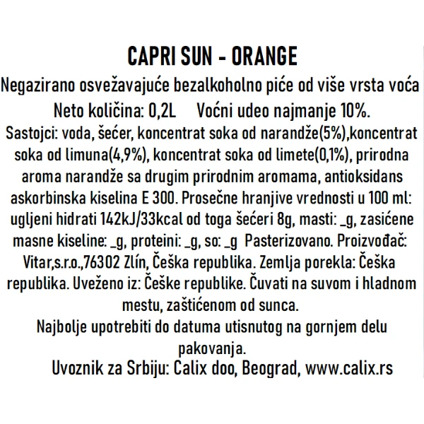 Capri-Sun je jedan od najpoznatijih dečijih pića na svetu! Jedinstven po ukusu i dizajnu Svi proizvodi od Capri-Sun su napravljeni od izuzetno malo sastojaka Svaki sokić Capri-Sun je bez veštačkih boja, ukusa i konzervansa Capri-Sun – jer dečiji osmeh sve govori! Voćni sokići koji se prave po posebnom receptu, kako bi bili omiljeni mališanima širom sveta.