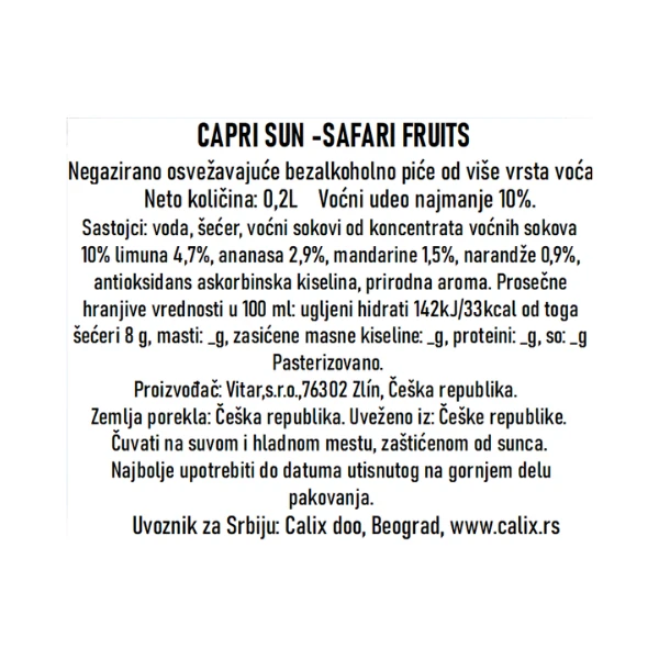 Capri-Sun je jedan od najpoznatijih dečijih pića na svetu! Jedinstven po ukusu i dizajnu Svi proizvodi od Capri-Sun su napravljeni od izuzetno malo sastojaka Svaki sokić Capri-Sun je bez veštačkih boja, ukusa i konzervansa Capri-Sun – jer dečiji osmeh sve govori! Voćni sokići koji se prave po posebnom receptu, kako bi bili omiljeni mališanima širom sveta.