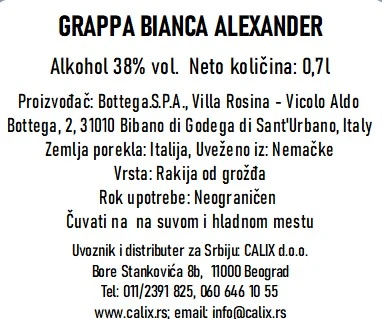 Kvalitet i briga o sirovinama predstavljaju prvi i najvažniji korak za proizvodnju dobre rakije. Iz tog razloga, zdrava, sveža i vinska komina sorti koje se uzgajaju na odgovarajućim površinama pažljivo se čuvaju kako bi se očuvalo svo njihovo kvalitativno nasleđe. Alex White Grappa, koja potiče od mešavine najpoznatijih i najpoznatijih vinove loze severoistočne Italije, proizvodi se u tri faze destilacije koje se izvode na različitim temperaturama iu tradicionalnim aparatima za bakar, koji omogućavaju obradu u vakuumu (veća zaštita arome) i u kojima se zagrevanje odvija u bain-marie (indirektan i stoga delikatniji sistem). Ovo rezultira mekom, rafiniranom grapom koja se, pre flaširanja, rafiniše u čeličnim rezervoarima oko 6 meseci, u periodu tokom kojeg se aromatični profil poboljšava, a oštre ivice omekšavaju. .