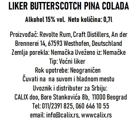 Prepustite se neodoljivom užitku sa Butterscotch Pina Colada likerom ,savršenim spojem egzotičnih aroma i kremaste slatkoće koja osvaja na prvi gutljaj. Ovaj jedinstveni liker kombinuje sočne note ananasa i kokosa sa toplim, karamelasto-puterastim ukusom buterskotča, koji nastaje od savršene harmonije putera i smeđeg šećera. Svaki gutljaj donosi savršenu ravnotežu tropskog voća i bogate karamele, čineći ovaj liker izuzetno pitkim, laganim i zavodljivim. Butterscotch Pina Colada je pravi izbor za one koji traže nešto više – luksuznu kremastu teksturu i neodoljivu aromu koja osvaja sva čula. Bez obzira da li želite da se opustite ili da impresionirate goste, ovaj liker će svaki trenutak učiniti posebnim. Zatvorite oči, uživajte i dozvolite da vas ponese pravi tropski raj u čaši.