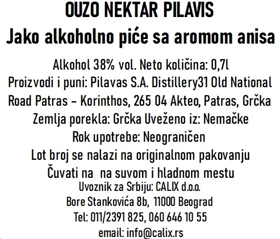 Nacin serviranja: | Uzo Nektar Pilavas preporučuje se služiti rashlađen, samostalno kao aperitiv ili razblažen hladnom vodom, što stvara osvežavajući koktel sa karakterističnim mlečnim zamućenjem. Savršen je i uz lagane grčke zalogaje poput maslina, sireva i morskih plodova. Idealna temperatura serviranja je 8–12°C. |