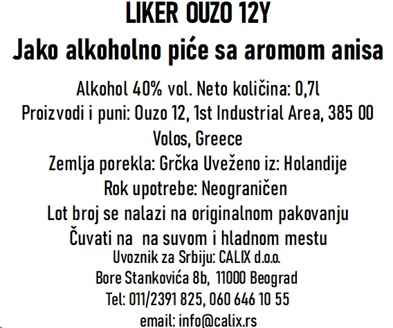 Uzo ili „Ouzo 12“ je poznato grčko piće koje se proizvodi od anisa, te njegovo ime datira iz legendarne „Bačve br. 12“, iz koje su braća Kalojanis služila svoje najbolje piće od 1880. godine u svojoj maloj kafani u Carigradu. U regionu je ubrzo postao poznat po svom delikatnom aromatičnom ukusu, što je podstaklo njegovu braću da započnu proizvodnju i flaširanje Uzo 12 . Do danas se uzo 12 pravi po istom tajnom receptu i najpoznatiji je specijalitet od anisa na svetu. Bilo da se servira čist, na ledu ili kao dugo piće sa malo hladne vode - Ouzo 12 je savršen pratilac za uživanje u nezaboravnim trenucima sa dobrim prijateljima. Ouzo 12 se fokusira na istinsko grčko gostoprimstvo: „najbolje za moje prijatelje“.