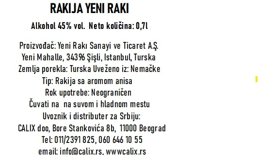 Raki (ili turska rakija) je tradicionalno tursko žestoko piće, slično grčkom uzo-u ili bliskoistočnom araku, poznato po jakoj anisovoj aromi i karakterističnoj beloj zamućenosti kada se pomeša sa vodom. Yeni Rakı nije samo piće – to je simbol turskog gostoprimstva i uživanja. Sa tradicijom dugom preko 300 godina, nastaje od najfinijeg anadolskog grožđa i aromatičnog anisa, što mu daje prepoznatljiv ukus i miris. U procesu destilacije pažljivo se spajaju prirodni sastojci – fermentisano zrelo grožđe, čist anis i sveža izvorska voda. Kada se pomeša s vodom, rakija poprima karakterističnu mlečnobelu nijansu – poznatu kao „lavlje mleko“, što svedoči o njenom pravom poreklu i kvalitetu. Najbolje se služi blago ohlađena (8–10°C), uz dobru hranu i još bolje društvo.
