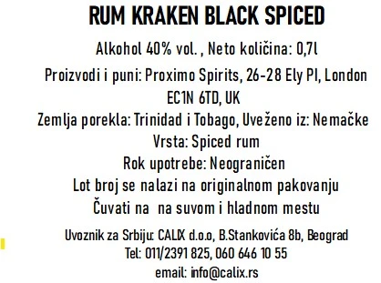 Rum Kraken Black Spiced je tamni rum i nazvan je po mitskom morskom čudovištu Kraken. Ovaj rum ima karakterističan ukus koji ga čini popularnim među ljubiteljima ruma i koktela. Kraken Black Spiced rum proizvodi se od mešavine destilata starog do 5 godina, a nakon toga se obogaćuje različitim začinima kako bi se postigao složen i profinjen ukus. Među začinima koji se koriste u proizvodnji ovog ruma su vanila, cimet, đumbir... Zbog svog karakterističnog ukusa i privlačnog pakovanja koje uključuje prepoznatljiv dizajn Krakena, ovaj rum je postao popularan među ljubiteljima ruma i koktela širom sveta.
