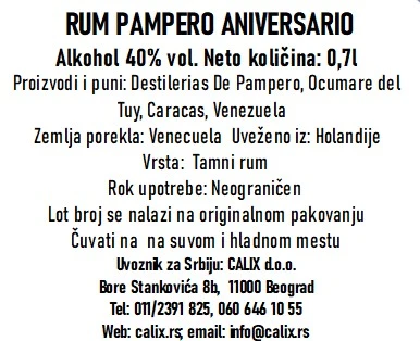Pampero Rum je napravljen u sunčanoj Venecueli u Južnoj Americi, vrhunskog je kvaliteta i profinjenog ukusa zbog čega se nudi u finoj, visokokvalitetnoj kožnoj torbi, na kojoj je ugraviran znak destilerije. Sazreva u buradima od hrasta do 10 godina i ima prepoznatljivu aromu koja je kompleksna i najvišeg kvaliteta. Pampero Rum se smatra najboljim južnoameričkim rumom zbog čega već nekoliko decenija zauzima posebno mesto među ljubiteljima ovih pića.