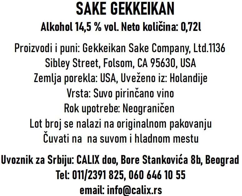 Sake Gekkeikan je popularno japansko alkoholno piće dobijeno fermentacijom poliranog (glatkog) pirinča. Gekkeikan je poznati proizvođač sakea i ima širok asortiman različitih verzija sakea sa različitim nivoima kvaliteta i ukusa. Izuzetno se slaže uz japansku kuhinju, ukusnu ribu i školjke, jela od svežeg zelenog povrća i azijska jela od kokosa.