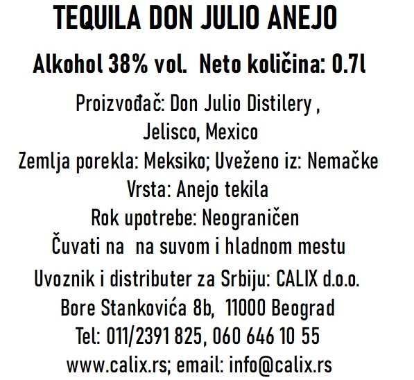 Don Julio Anejo je posebna tekila koja 18 meseci provodi u bačvama belog hrasta, pa je aroma defnitivnio uočljiva prilikom degustacije. Don Julio Anejo je fina smeđa tekila koja je na poseban način kombinuje drvo i agavu (kaktus). Osnivač poznatog brenda tekile Don Julio Gonzales isprobao je sve korake u proizvodnji tekile . Od sadnje plavih agava do njihovih skladištenjima u buradima , prilagodio je čitav postupak da bi stvorio prvu luksuznu tekilu. + Danas „Don Julio“ je jedan od najpopularnijih brendova tekile u svetu, a „Anejo“ je vodeća kompanija destilerije, a Don Julio Anejo tekila je proglašena za najprodavaniju i najmoderniju tekilu po izboru 50 najboljih svetskih barova!