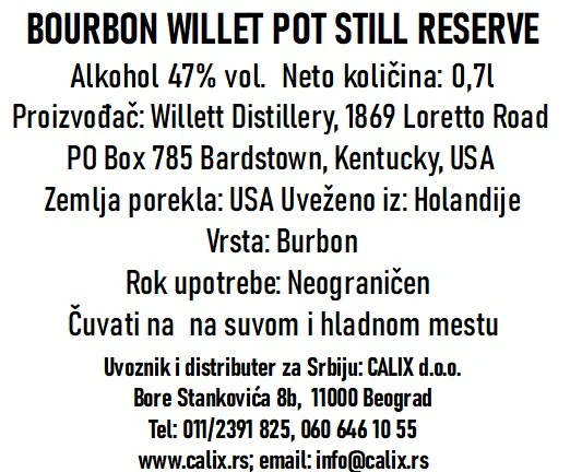 Viski Willett Pot Still je burbon koji je zaštitni znak destilerije Willet, (destilerija koja datira iz 1841. godine) sa posebno dizjaniranom bocom koja podseća na dekanter. Poznavaoci viskija posebno cene prisutne note vanile i kokosa, krem brulea i kedrovine u Willett burbonu. Visok udeo raži i ječma daju ovom burbonu veoma intenzivan ukus. Specifičan proces destilacije kroz „pot still“ sudove pruža ovom viskiju visok kvalitet i postojan ukus.