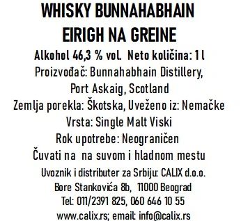 Viski Bunnahabhain Eirigh Na Greine se ne može nazvati tipičnim viskijem koji dolazi sa ostrva Islay, jer uglavnom viski sa ostrva imaju jaku dimljenu aromu. Ali u ovom slučaju nije tako. Viski Bunnahabhain Eirigh Na Greine ima fantastičnu aromu koja je proizvedena upotrebom različitih buradi. Pre svega, ovo žestoko piće se puni u nekadašnje bačve burbona, tako da to aromatizovano drvo američkog belog hrasta utiče na prvi dodir sa ukusom. Posle toga se puni u buradi crvenog vina koja su se ranije koristila za proizvodnju vina u Francuskoj i Italiji. Drvo začinjeno crvenim vinom se retko koristi u proizvodnji viskija, ali u ovom slučaju daje odličan doprinos aromi ovog viskija. Boja ove fine „kapljice viskija“ je potpuno prirodna i ne zahteva nikakve veštačke dodatke. Izraz Eirigh Na Greine je galski i znači „jutarnje nebo“. U slučaju da neko pita za ime ovog finog viskija, izgovara se „Ae-ree ne grei-niuh“. Destilerija Bunnahabhain se nalazi severno od sela Port Askeig, nedaleko od destilerije Caol Ila, na ostrvu Islay. Ovo ostrvo nije samo deo Unutrašnjih Hebrida. Nazivaju je čak i "Kraljicom Hebrida". Količine viskija Bunnahabhain Eirigh Na Greine su ograničene, upravo zbog toga važi za limitiranu seriju viskija!
