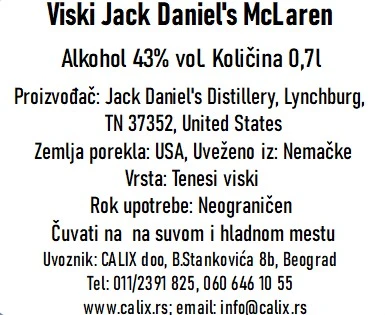 Jack Daniel’s McLaren Edition No. 3 je rezultat saradnje između legendarnog američkog Jack Daniel’s-a i prestižnog McLaren Formula 1 tima – spoj tradicije i adrenalina u jednoj kapljici. Ova limitirana serija odiše luksuzom i retkošću. Boca, u kombinaciji mat crne i narandžaste, podseća na aerodinamične linije McLaren bolida – elegantna, snažna i neodoljiva.Unutra se skriva Tennessee whiskey iz Lynchburga, glatkog karaktera, bogate teksture i dubokih aroma vanile, karamele i tostiranog hrasta, sa suptilnim voćnim i začinskim tonovima koji osvajaju nepce. Sa 43 % alkohola, svaka kap nosi snagu, preciznost i eleganciju, baš kao trkački tim koji je inspirisao ovu ediciju. Ovo nije samo viski – ovo je retki kolekcionarski dragulj, oličenje prestiža i dokaz da istinska vrednost uvek ostaje u centru pažnje.Jack Daniel’s McLaren Edition No. 3 ,za one koji žele više od pića.Za one koji žele doživeti brzinu, luksuz i savršenstvo u svakoj kapljici. Otkrijte viski koji nije za svakoga.