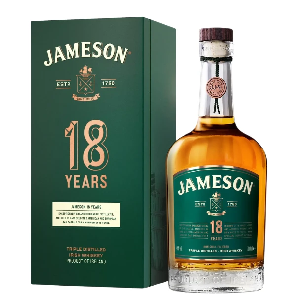 Jameson 18 godina predstavlja vrhunac irske tradicije i majstorstva, nastao u čuvenoj destileriji Jameson. Ovaj izuzetni irski mešani viski star 18 godina kreiran je od dve vrste pot still viskija (viski napravljen kombinacijom ječmenog slada i nesladovanog ječma, destilisan u tradicionalnim bakarnim kotlovima, poznat po bogatoj teksturi i punom ukusu), uz pažljivo odmeren udeo single grain viskija (viski dobijen od različitih žitarica, laganiji i mekši, koji daje eleganciju i zaokruženost mešavini).Sazrevao je u ručno izrađenim burbon i šeri hrastovim bačvama poreklom iz Evrope i Amerike, da bi svoj završni, najfiniji karakter dobio dodatnim odležavanjem u potpuno novim, nekorišćenim burbon bačvama. Ovakav proces stvara složen, elegantan i duboko uravnotežen profil.