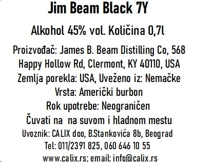 Kada viski provede punih sedam godina u pažljivo odabranim buradima, dostiže ono što nazivamo slatkom tačkom ,savršenu ravnotežu glatkoće i bogatstva ukusa. Tada se otkrivaju slojevi karamele, vanile i toplog, ugljenisanog hrasta, dok tečnost poprima prelepu zlatnu boju. Upravo tu magiju možete otkriti u svakom gutljaju Jim Beam Black viskija. Ovo je viski punog tela, sa izraženim karakterom i glatkom završnicom. Njegova aroma donosi note ugljenisanog hrasta, smeđih slatkiša i suptilne vanile, dok ukus otkriva bogatu karamelu i začine za pečenje, uz toplinu koja ostaje na nepcu. Odležan godinama duže od originalnog Jim Beama, Jim Beam Black je rezultat strpljenja, posvećenosti i veštine.Uživajte u Jim Beam Black-u čistom, sa ledom, ili u klasičnom koktelu Jim Beam Black Old Fashioned. Na koji god način da ga poslužite, otkrićete bogatstvo ukusa koje je stvoreno za prave ljubitelje viskija.