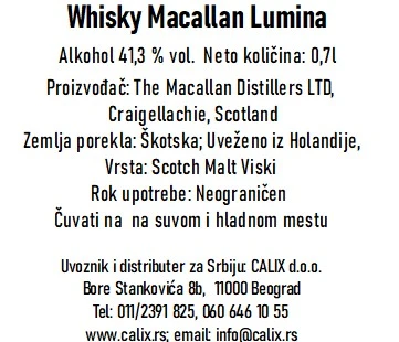Macallan Lumina Single Malt Viski je karakteričan po sazrevanju u posebnim Sherry bačvama zbog čega sherry nota dominira nad aromama hrasta i vanilije.