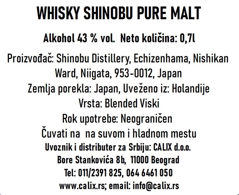 Viski Shinobu Pure Malt Viski stiže direktno iz Niigate, Japana, mesta koje se slavi zbog svoja "tri bela blaga": snega, pirinča i sakea. Naziv "Shinobu" na japanskom jeziku nosi duboko značenje "strpljenost" i predstavlja duh samuraja, simbolizujući vreme, strpljenje i istrajnost potrebne za pravljenje viskija. Ovaj viski je sazrevao u nekadašnjim bačvama za šeri i burbon. Majstor destiler gospodin Usami pažljivo bira samo najfinije viskije, a zatim ih završava sazrevanje u japanskim buradima od Mizunare, dajući im posebnu notu bogatstva i kompleksnosti. Koshi-No Shinobu Pure Malt Viski predstavlja simbiozu tradicionalne japanske obrade sa najsavremenijom tehnologijom, stvarajući iskustvo koje očarava sva čula i oplemenjuje dušu ljubitelja viskija širom sveta.