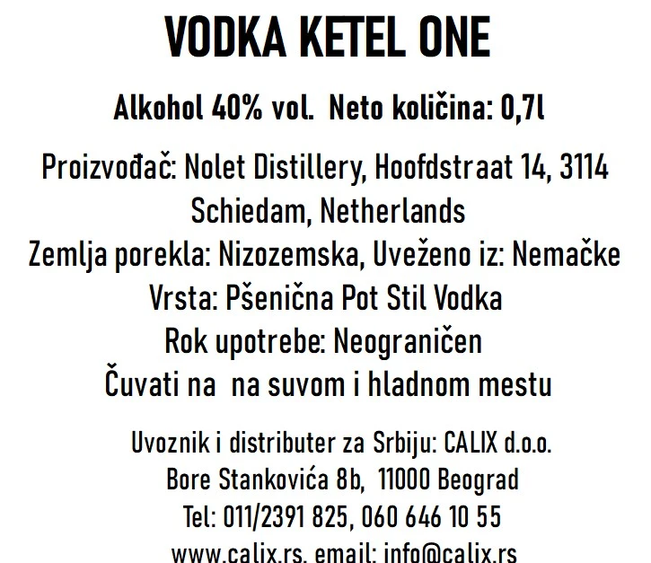 Vodka Ketel One je pravo savršenstvo destilacije, stvorena korišćenjem pažljivo odabrane evropske pšenice, koja pruža osnovu za izuzetan kvalitet. Kombinacija modernih tehnika destilacije sa tradicionalnim metodama omogućava postizanje izuzetnog ukusa koji je ujedno oštar i savršeno gladak na kraju.Svaka kap Vodka Ketel One prolazi kroz rigorozan proces destilacije, garantujući besprijekornu čistoću i sofisticiranost. Od trenutka kada je otvorite, osetićete bogat, delikatan miris koji uvodi u ukus koji se savršeno balansira između oštrine i glatkoće. Senzacija u ustima je prijatno ujednačena, a završetak je dugotrajan i izuzetno gladak. Vodka prolazi kroz četiri ključna testa –miris, ukus, osećaj i završetak. Svaki element je pažljivo usklađen kako bi se stvorilo nezaboravno iskustvo. Bilo da je pijete čistu, u koktelu ili kao sastavni deo omiljenog pića, Vodka Ketel One pruža neverovatan užitak svakom gutljaju. Idealna za svaku priliku, bilo da je u pitanju opuštanje sa prijateljima ili posebna večera, Vodka Ketel One je simbol kvaliteta, elegancije i pažnje prema detaljima.